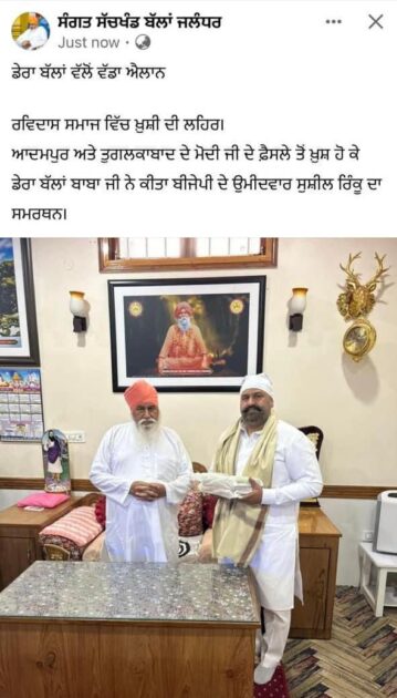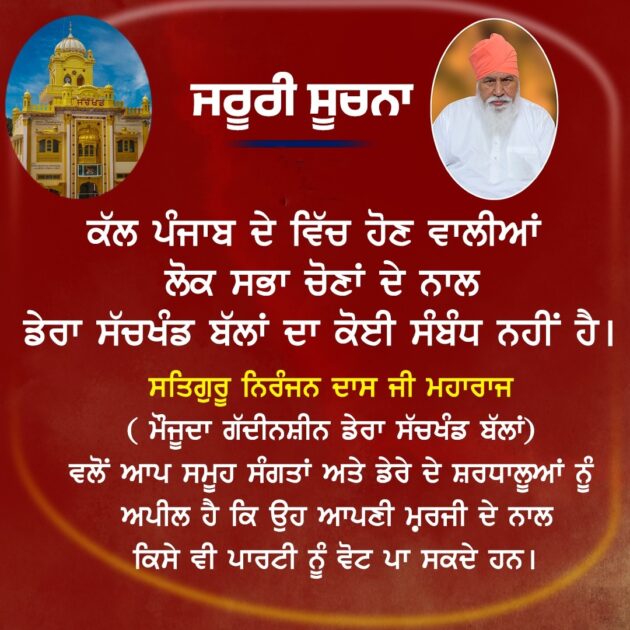 ਡੇਰਾ ਸੱਚਖੰਡ ਬੱਲਾਂ ਨੇ ਸਮੂਹ ਸੰਗਤਾਂ ਨੂੰ ਬੇਨਤੀ ਕੀਤੀ ਹੈ ਕਿ ਕੁੱਝ ਸ਼ਰਾਰਤੀ ਅੰਦਰ ਡੇਰੇ ਦੇ ਨਾਮ ਤੇ ਫੇਕ ਆਈ ਡੀ ਬਣਾ ਕੇ ਵੋਟਾਂ ਪਾਉਣ ਦੀ ਅਪੀਲ ਕਰ ਰਹੇ ਹਨ ਜੋ ਕਿ ਗਲਤ ਹੈ ਤੇ ਡੇਰੇ ਦਾ ਇਸ ਨਾਲ ਕੋਈ ਸਬੰਧ ਨਹੀ ਹੈ। ਉੱਨਾਂ ਕਿਹਾ ਕਿ ਕਿਸੇ ਫੇਕ ਆਈ ਡੀ ਤੇ ਯਕੀਨ ਨਾ ਕੀਤਾ ਜਾਵੇ ਤੇ ਡੇਰੇ ਦੇ ਨਾਮ ਤੇ ਫੇਕ ਆਈ ਡੀ ਬਣਾਉਣ ਵਾਲਿਆਂ ਤੇ ਕਾਰਵਾਈ ਕੀਤੀ ਜਾਵੇਗੀ।