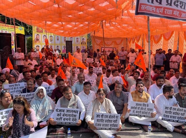 जालंधर ( दिशा सेठी ) : जालंधर में जय श्री राम बोलने पर एक समुदाय विशेष द्वारा मारपीट की घटना को लेकर सनातनी रक्षा मंच की तरफ से श्री राम चौंक में धरना लगाया गया जिसमें महानगर की विभिन्न धार्मिक, सामाजिक संस्थाओं व मंदिर कमेटियों ने भाग लिया। इस धरने की अगुवाई सुशील शर्मा, महेश गुप्ता, योगेश धीर और सारे संत समाज ने की। इस दौरान सनातनी नेताओं ने कहा कि देश में कई जगह पर ऐसी घटनाएं हुई हैं जहां एक समुदाय विशेष द्वारा यह नारे लगे थे कि ‘सर तन से जुदा कर देंगे सर तन से जुदा कर देंगे’ और इसके पहले देश के कई हिस्सों में ऐसी घटनाएं हो चुकी हैं अब पंजाब में भी माहौल बिगाड़ने की साजिश के तहत ऐसा हुआ है।